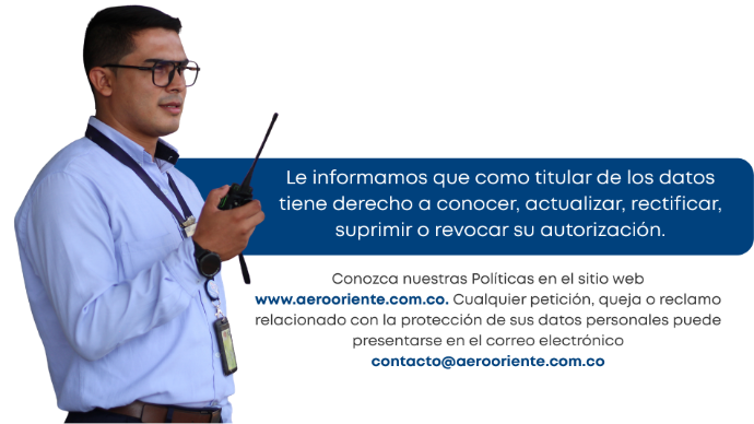 En cumplimiento de la ley 1581 de 2012 y del decreto 1377 de 2013, le informamos que el responsable del tratamiento de sus datos personales es Aeropuertos de Oriente S.A.S. (ADO). Por tal razón, usted acepta que sus datos sean almacenados y autoriza expresamente a ADO para utilizarlos dentro del proceso de Identificación Aeroportuaria y control de acceso de los aeropuertos de la RED, por un período de 10 años o hasta que usted solicite a ADO la eliminación o supresión de su información.